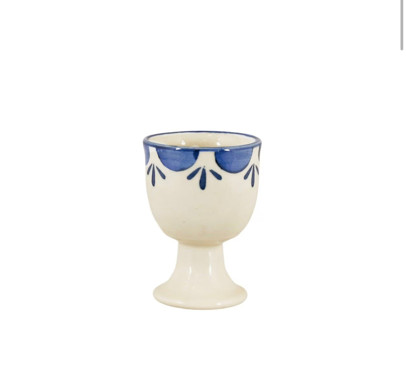 Äggkopp i stengods med handmålad dekorativ bård. Mönstret i serien Marion associerar tankarna till den franska landsbygden. Fina att kombinera och blanda med de andra motiven. Variationer kan förekomma i porslinet.