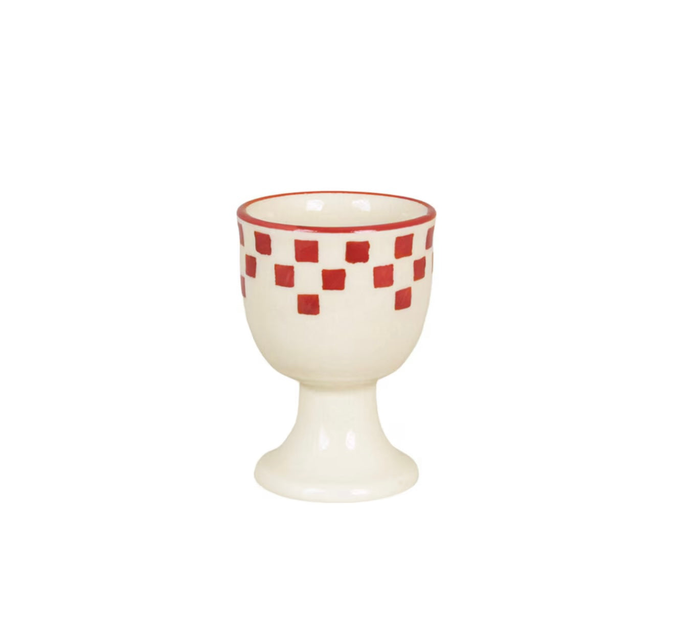 Äggkopp i stengods med handmålad dekorativ bård i härligt rött. Mönstret i serien Marion associerar tankarna till den franska landsbygden. Fina att kombinera och blanda med de andra motiven/färgerna. Variationer kan förekomma i porslinet.