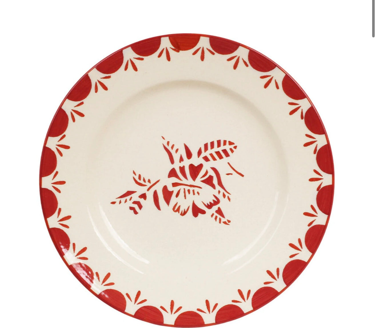Assiett i stengods med handmålat gammaldags motiv i härligt rött av en blomma och dekorativ bård. Mönstret i serien Marion associerar tankarna till den franska landsbygden. Variationer kan förekomma i porslinet.
