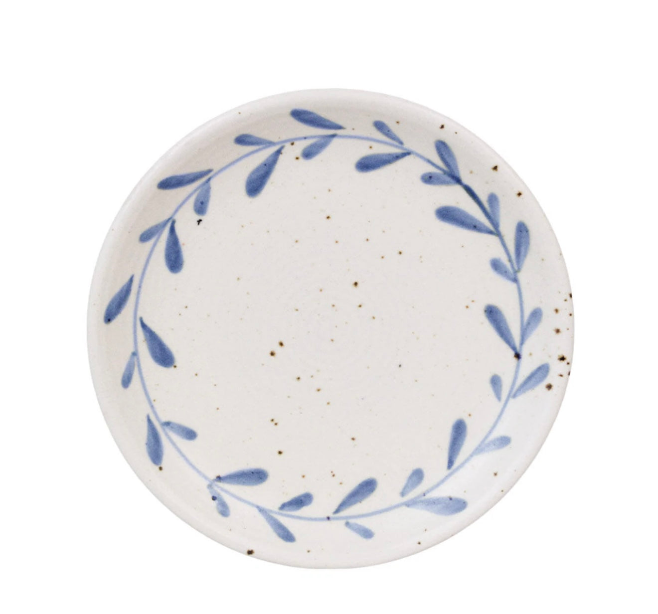 Assiett i stengodslera med prickar och och en vackert handmålad bård med ett dekorativt bladmönster. Prickarna på stengodset blir olika tydliga, beroende på temperaturen som godset bränts i, likaså nyansen på leran. Kombinera gärna med fler vackra artiklar ur serien Viola för att skapa ett komplett serveringsset som sprider en hemtrevlig och genuin känsla.