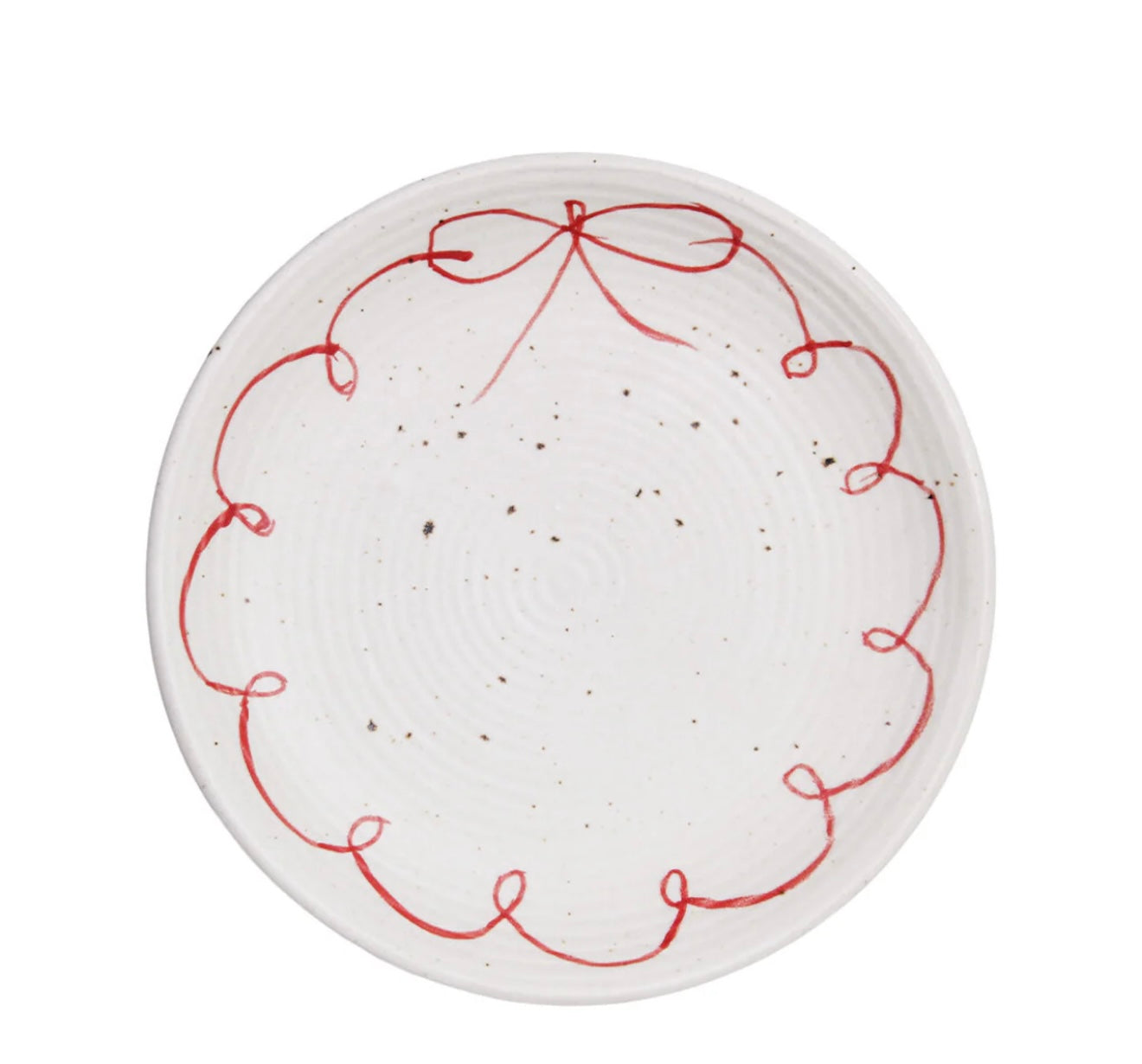 Assiett i stengodslera med prickar, vackert handmålad bård med dekorativ rosett. Prickarna på stengodset blir olika tydliga, beroende på temperaturen som godset bränts i, likaså nyansen på leran. Kombinera med fler delar i serien Viola för en fin helhet.