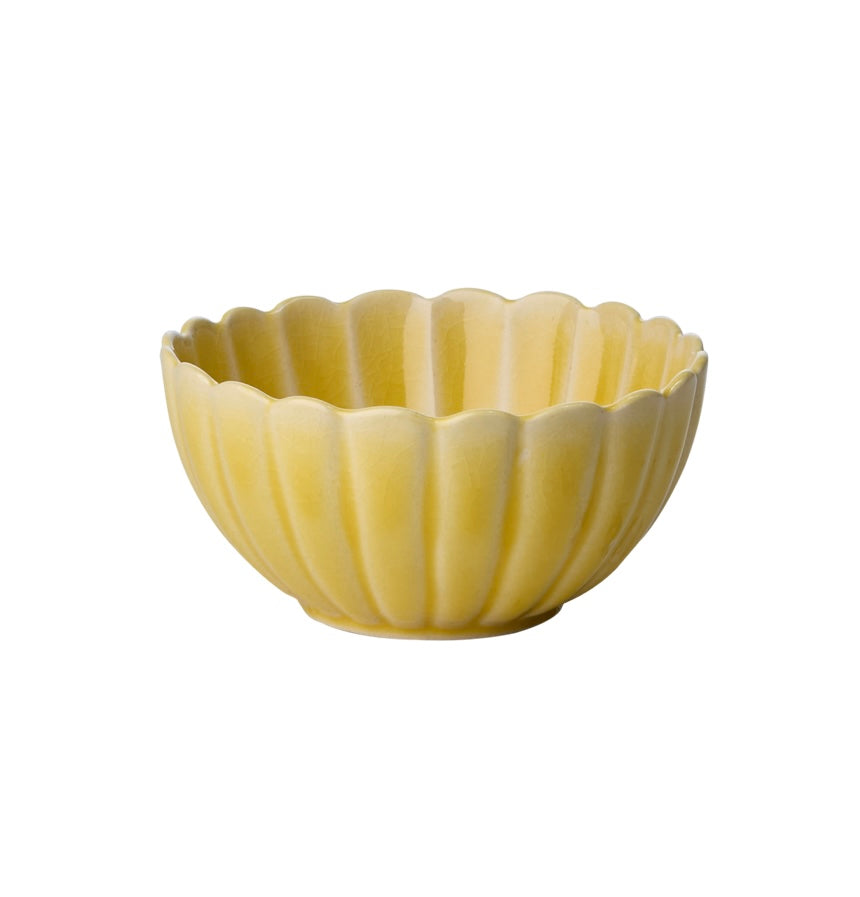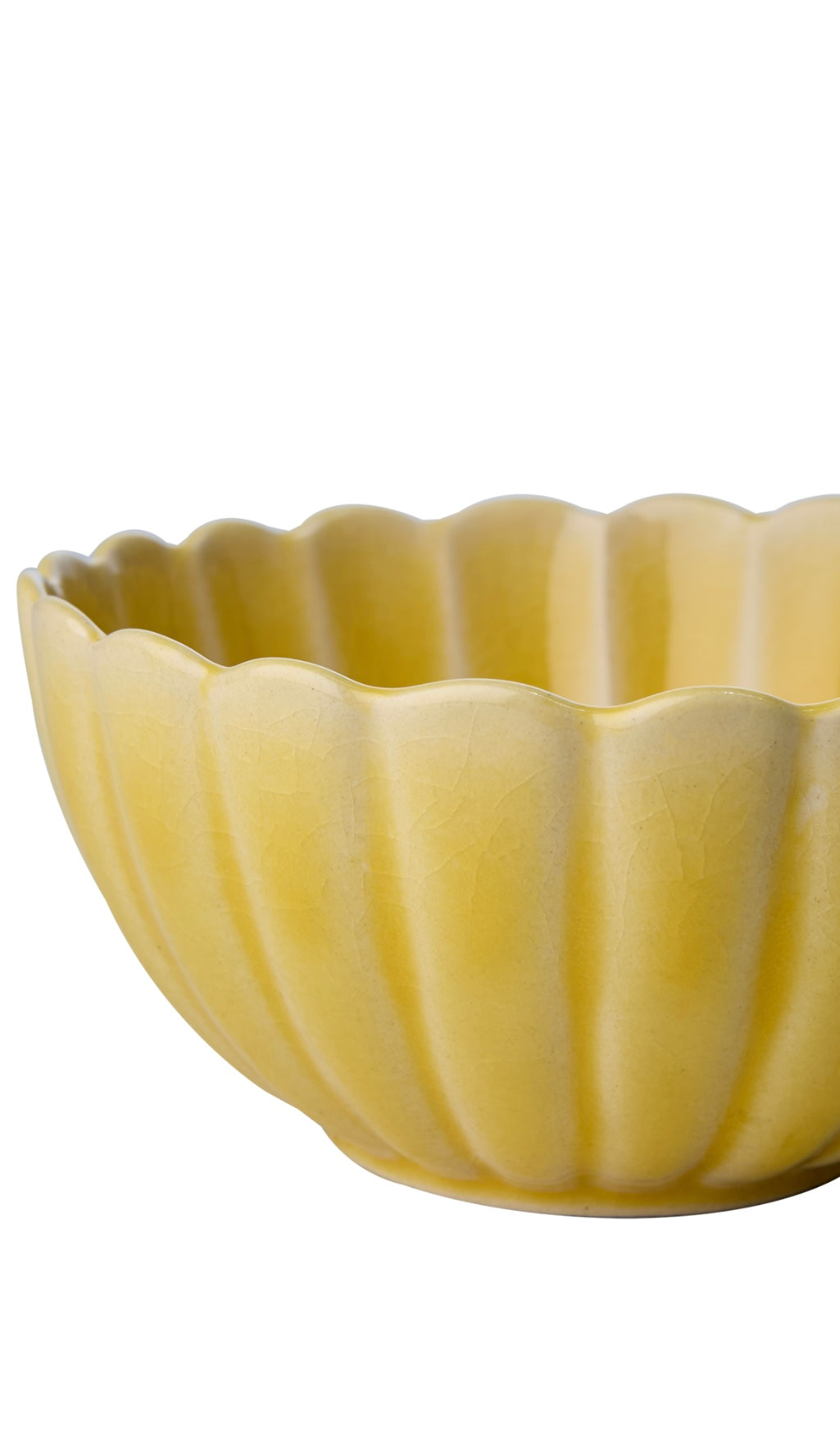 HULDA handgjord skål i gul nyans har en mjukt vågig kant och en glaserad yta som ger en elegant och levande karaktär. Perfekt för servering av allt från frukostflingor till snacks eller frukt, samtidigt som den bidrar med en stilfull detalj till dukningen.