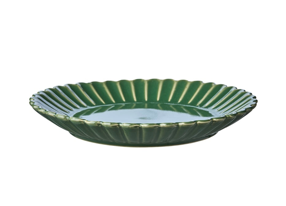 HULDA tallrik i grön nyans utstrålar lugn och balans. Den mjukt vågiga kanten tillsammans med det glaserade stengodset skapar en levande yta och en harmonisk form. En perfekt mindre tallrik att använda som assiett.