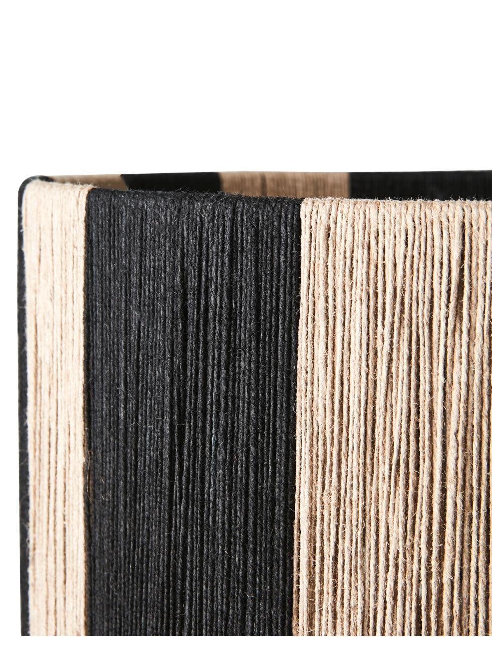Lekfull men stilren design: Den randiga juteskärmen i svart och natur skapar ett dekorativt skuggspel, inspirerat av 50‑talsretro och skandinavisk enkelhet.