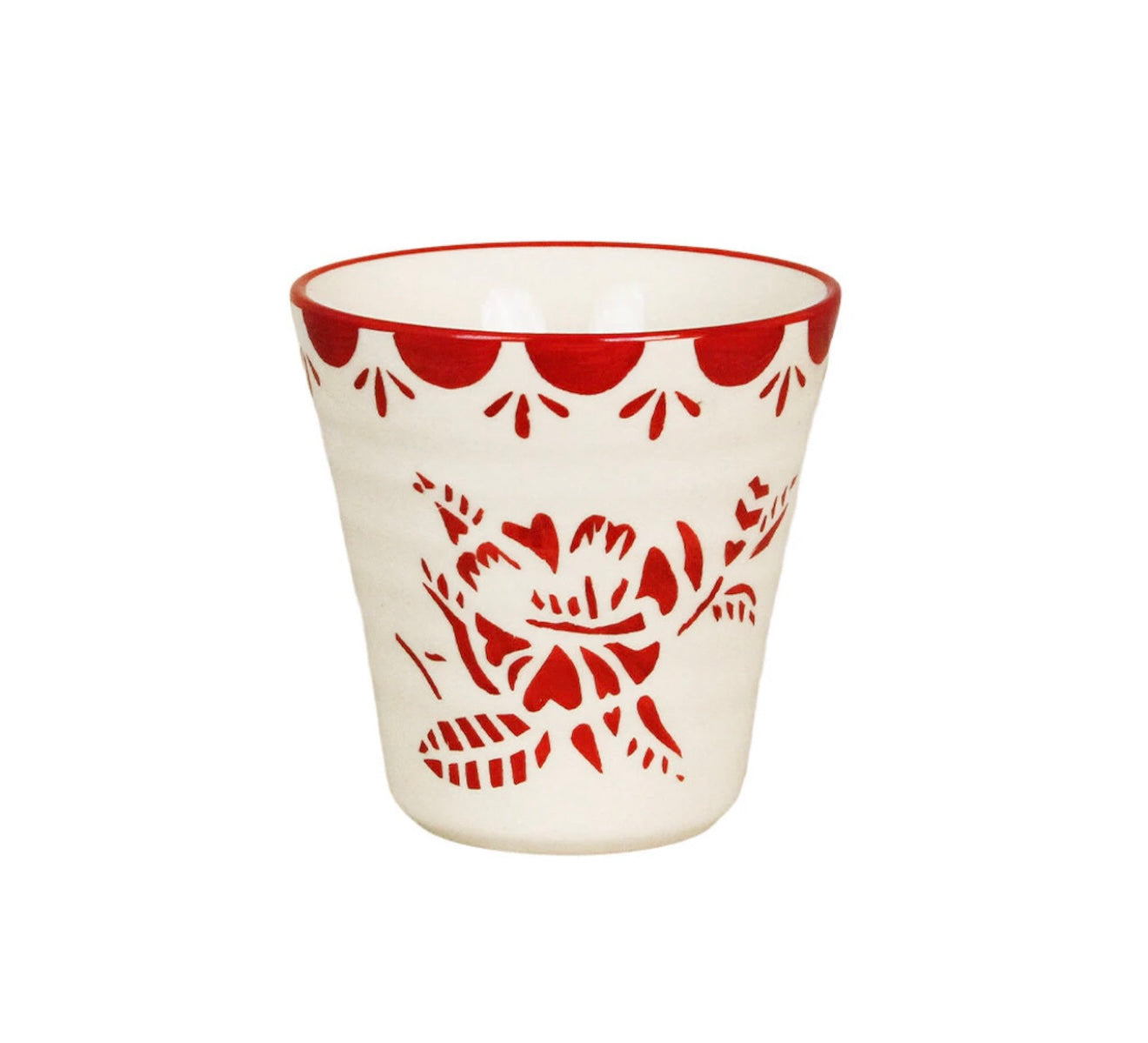 Serien Marion har utökats med ytterligare en färg, denna gång i härligt rött! Mugg utan handtag i stengods med handmålat gammaldags motiv av en blomma och dekorativ bård. Mönstret i serien Marion associerar tankarna till den franska landsbygden. Fina att kombinera och blanda med de andra motiven/färgerna. Variationer kan förekomma i porslinet.