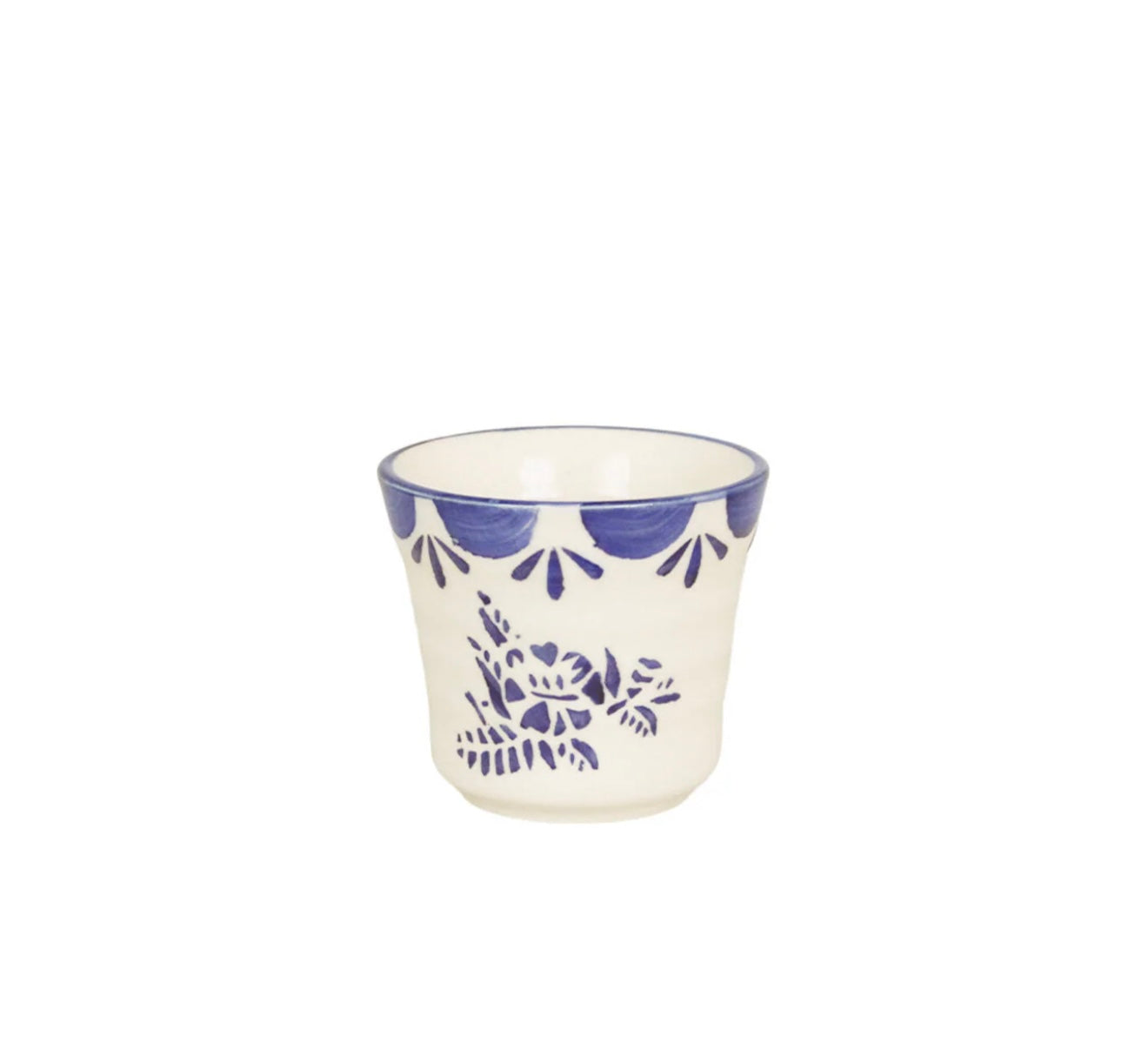 Serien Marion har utökats med en ny storlek på vår mugg utan handtag, denna storlek är passande för espresso. Gjord i stengods med handmålat gammaldags motiv av en blomma och dekorativ bård. Mönstret i serien Marion associerar tankarna till den franska landsbygden. Fina att kombinera och blanda med de andra motiven/färgerna. Variationer kan förekomma i porslinet.
