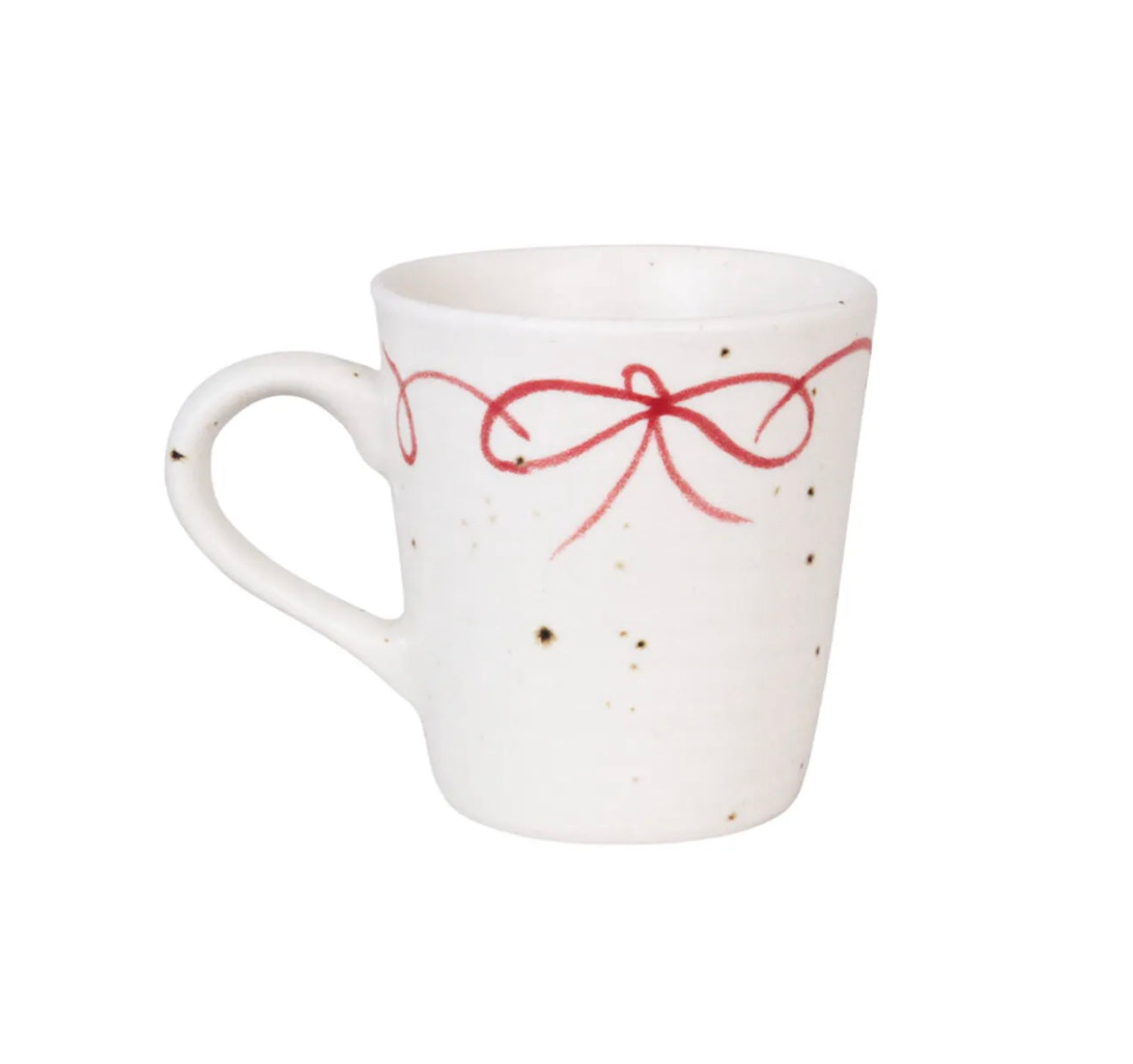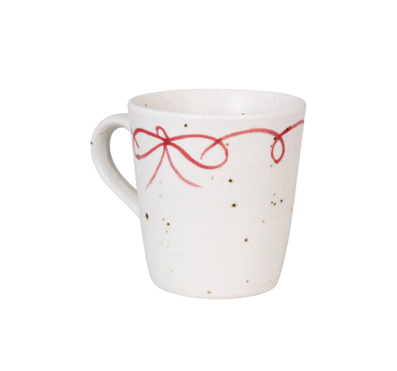 Mugg med handtag i stengodslera och prickar, vackert handmålad bård med dekorativ rosett. Prickarna på stengodset blir olika tydliga, beroende på temperaturen som godset bränts i, likaså nyansen på leran. Kombinera gärna med fler delar i serien Viola för en fin helhet.