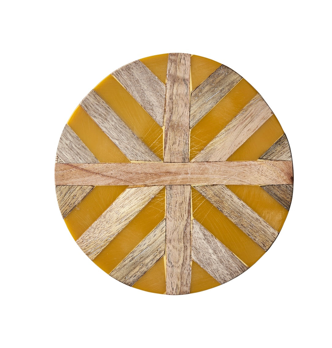 NICO glasunderlägg i natur och gult är ett uttrycksfullt tillbehör som livar upp dukningen med sin varma färgton. Tillverkat i trä och resin, där den naturliga känslan i träet möter den lekfulla och soliga gula nyansen. Det runda formatet och den smidiga ytan gör det både funktionellt och tilltalande, oavsett om det används till frukostbrickan, drinken eller middagsbordet.