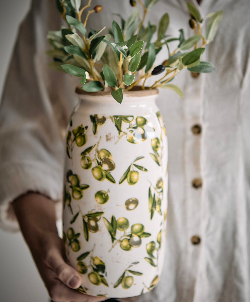 OLIVE vas kombinerar rustik känsla med tidlös skönhet. Med sitt detaljrika mönster av oliver och antika finish skapar den ett levande uttryck som passar perfekt för allt från snittblommor till torkade kvistar. Den gröna färgtonen förstärker vasens klassiska karaktär och gör den till en tidlös inredningsdetalj.