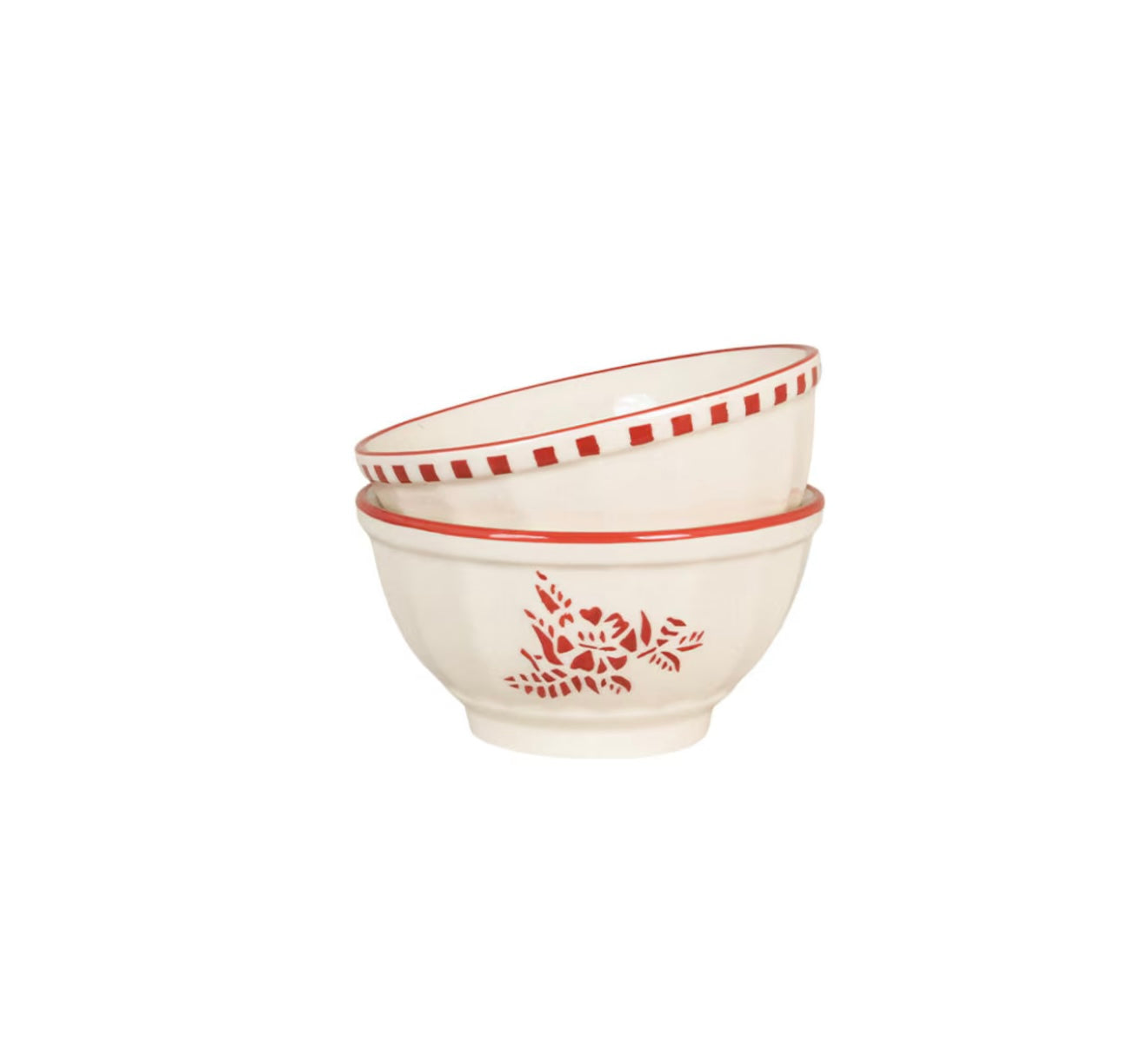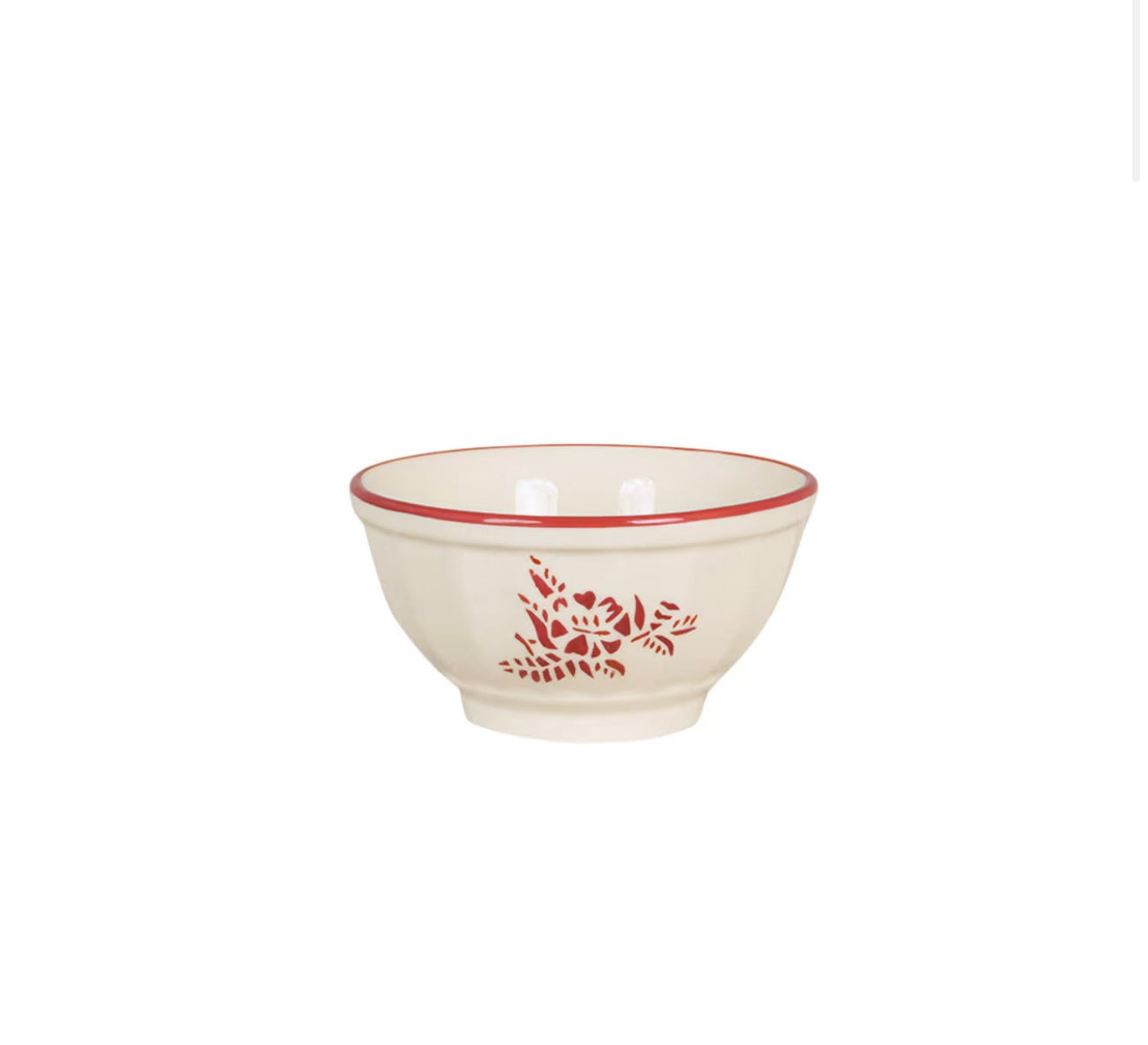 Skål i stengods med handmålat gammaldags mönster i rött av en blomma och målad överkant. Mönstret i serien Marion associerar tankarna till den franska landsbygden. Fina att kombinera och blanda med de andra motiven/färgerna. Variationer kan förekomma i porslinet.