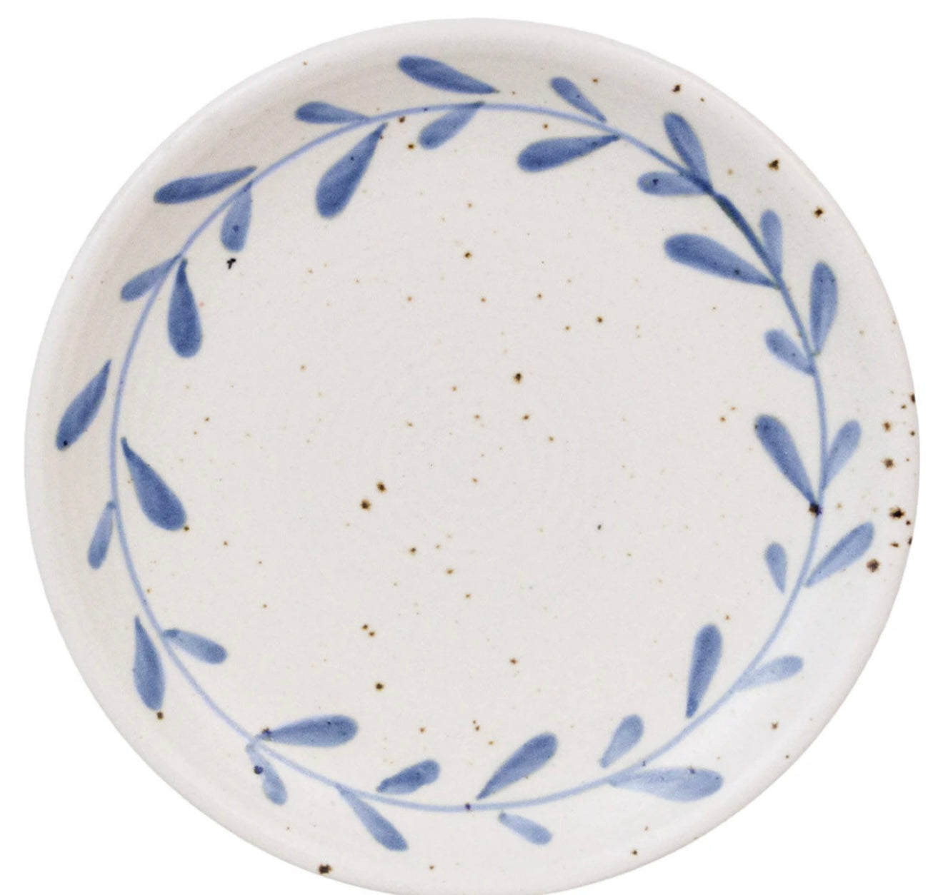 Tallrik i stengodslera med prickar och och en vackert handmålad bård med ett dekorativt bladmönster. Prickarna på stengodset blir olika tydliga, beroende på temperaturen som godset bränts i, likaså nyansen på leran. Kombinera gärna med fler vackra artiklar ur serien Viola för att skapa ett komplett serveringsset som sprider en hemtrevlig och genuin känsla.