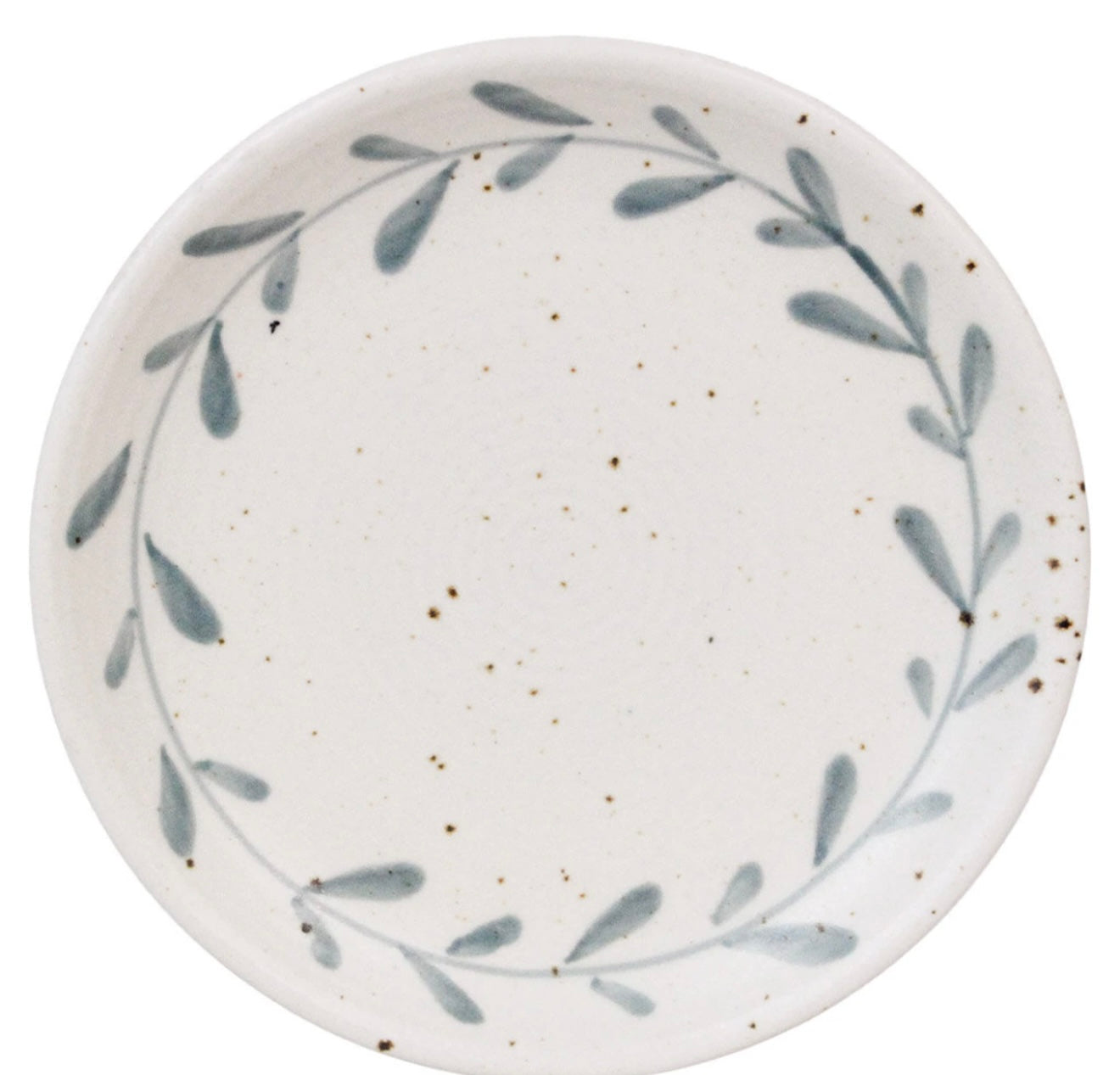Tallrik i stengodslera med prickar och och en vackert handmålad bård med ett dekorativt bladmönster. Prickarna på stengodset blir olika tydliga, beroende på temperaturen som godset bränts i, likaså nyansen på leran. Kombinera gärna med fler vackra artiklar ur serien Viola Blad för att skapa ett komplett serveringsset som sprider en hemtrevlig och genuin känsla.