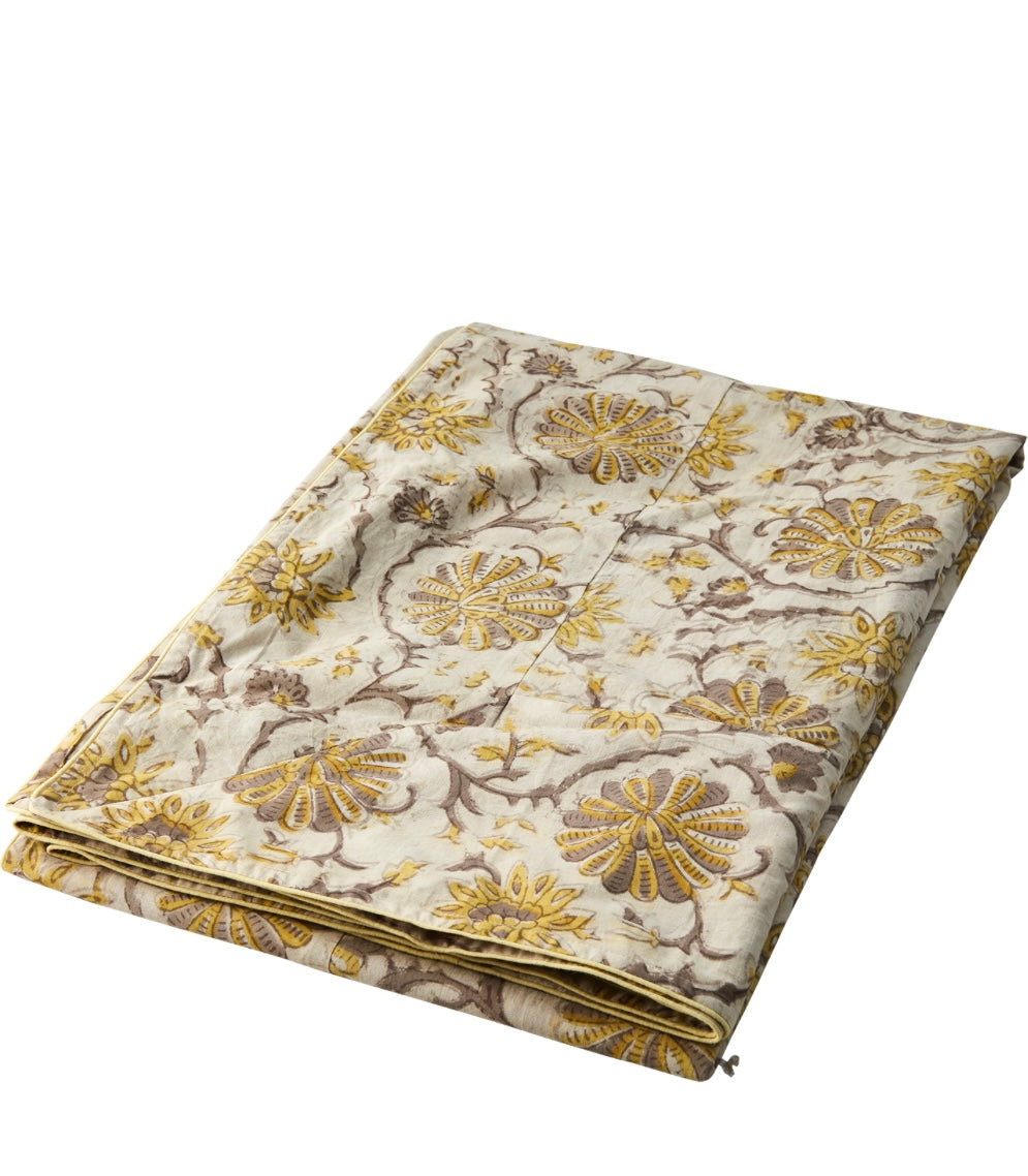 Lyft dukningen med den solgula Zinnia-bordsduken från Affari of Sweden. Tillverkad av 100 % bomull och handblocktryckt med blommönster som ger en varm och inbjudande känsla. Varje duk har unika variationer i mönster och nyans – ett hantverksmästerverk direkt till bordet.